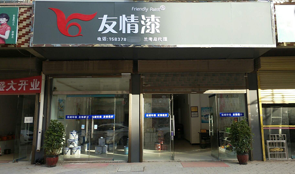 位于河南蘭考的友情漆代理店也于近日開張營業,其店內產品種類豐富,家裝系列產品琳瑯滿目,家裝產品專柜、防水產品專柜整齊擺放,店內員工正緊張忙碌的為經銷商及客戶介紹產品。友情漆蘭考油漆代理店的開業,將為當地裝修市場注入全新的活力,讓更多家庭使用到友情漆低碳環保優質的涂料產品。