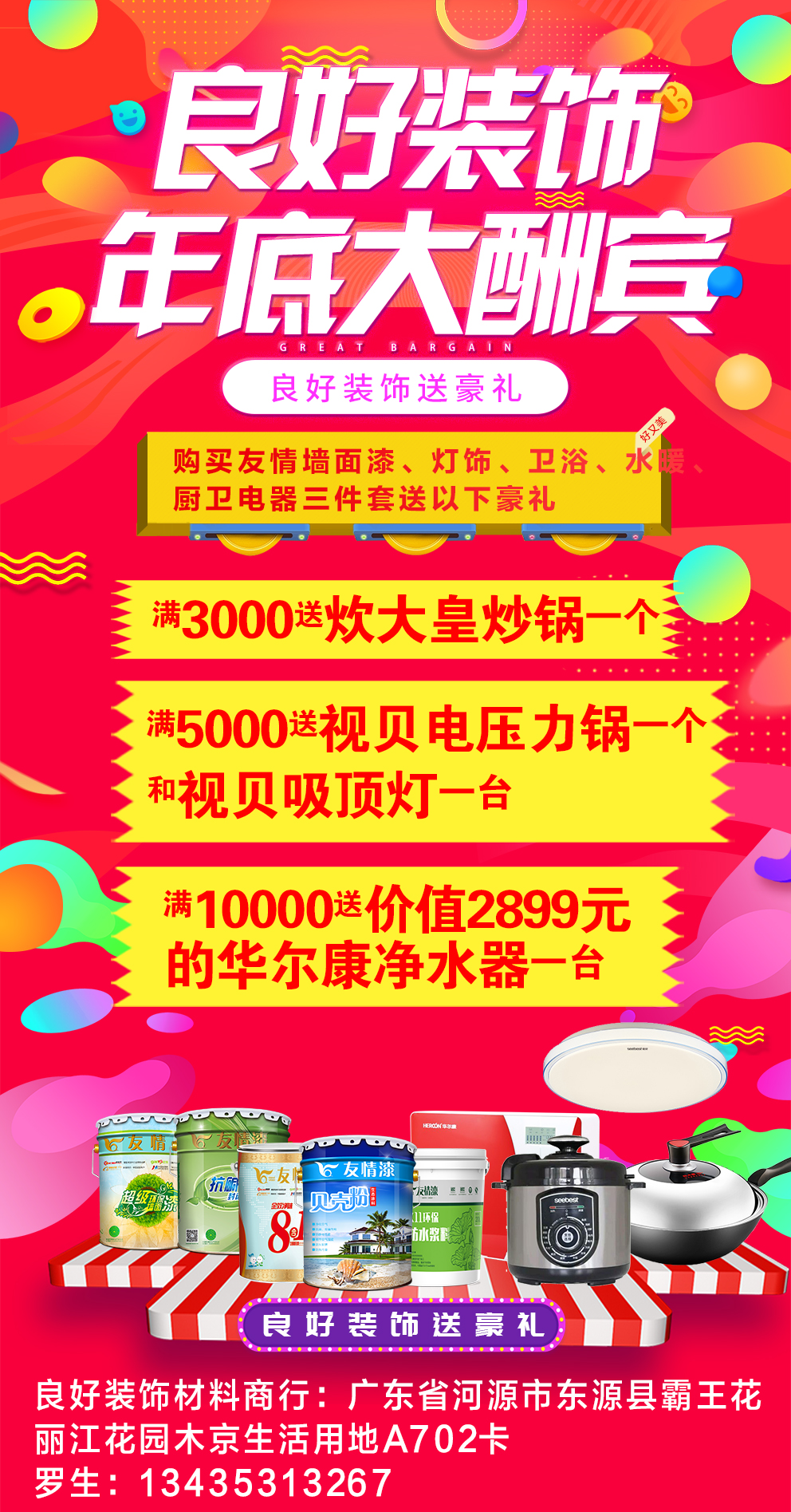 友情漆河源總代理良好裝飾行,在這一次的年底促銷活動(dòng)中,一次性送出的高達(dá)2900價(jià)值的禮品。其中,消費(fèi)滿3000元贈(zèng)送名牌炒鍋一個(gè),消費(fèi)滿5000元贈(zèng)送名牌壓力鍋一個(gè)和吸頂燈一盞,消費(fèi)滿10000元贈(zèng)送價(jià)值2900元的名牌凈水器一臺(tái)。
